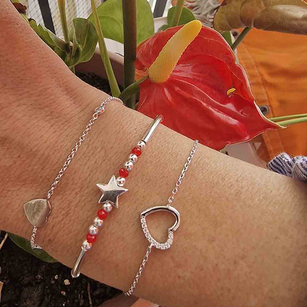 Pulsera Corazón Brillo Love elaborada en plata 925, con un corazón de 1 cm donde la mitad está decorada con circonitas que aportan luz y la otra mitad presenta un acabado liso que crea un elegante contraste. Su largo ajustable de 17 + 3 cm permite un ajuste cómodo y versátil, ideal para añadir un toque romántico y moderno a cualquier look.