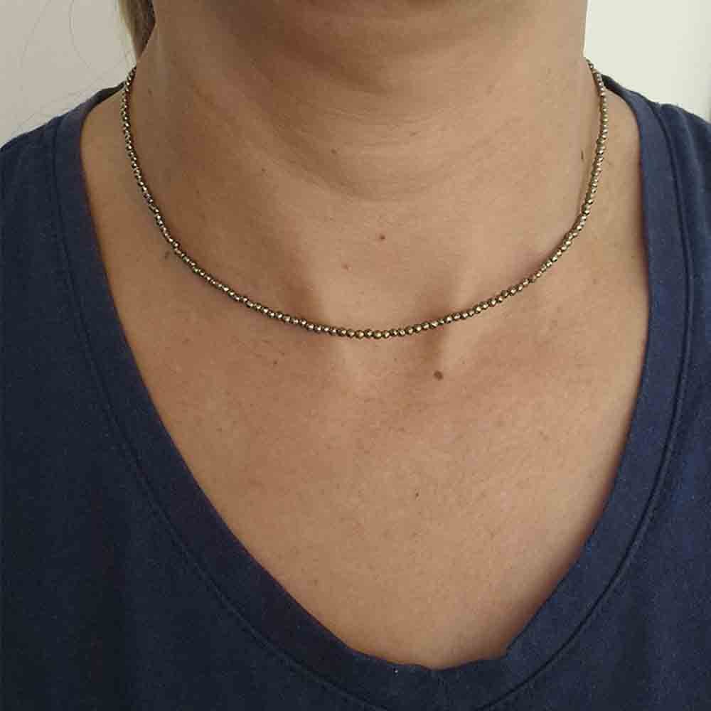 Collar Pirita Aura de la Abundancia elaborado con finas cuentas de pirita de 2 mm, conocidas por su brillo metálico y su asociación con la prosperidad y la energía protectora. Puedes pedirlo solo o acompañado del colgante Sigilo de la Abundancia, creando una pieza con mayor intención y fuerza simbólica. Un collar moderno y lleno de significado, ideal para atraer buena fortuna y estilo.