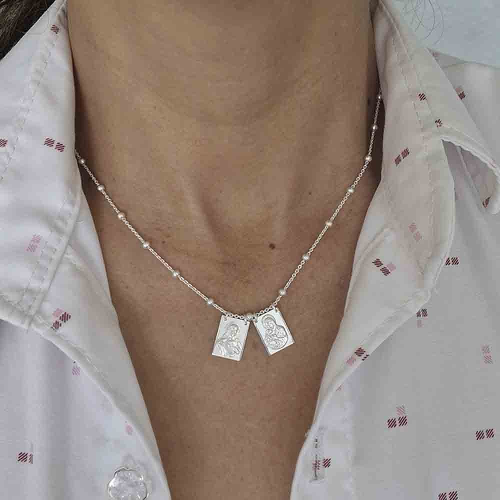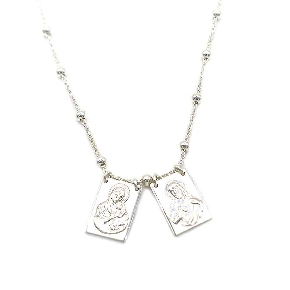 Escapulario Fe Eterna elaborado en plata, con cadena de bolitas de 3 mm que aporta un estilo clásico y elegante. Las medallas del escapulario miden 15 mm de largo, ofreciendo un equilibrio perfecto entre presencia y delicadeza. Su largo ajustable de 42 + 3 cm permite un uso cómodo, siendo una pieza con profundo significado espiritual ideal para llevar a diario.