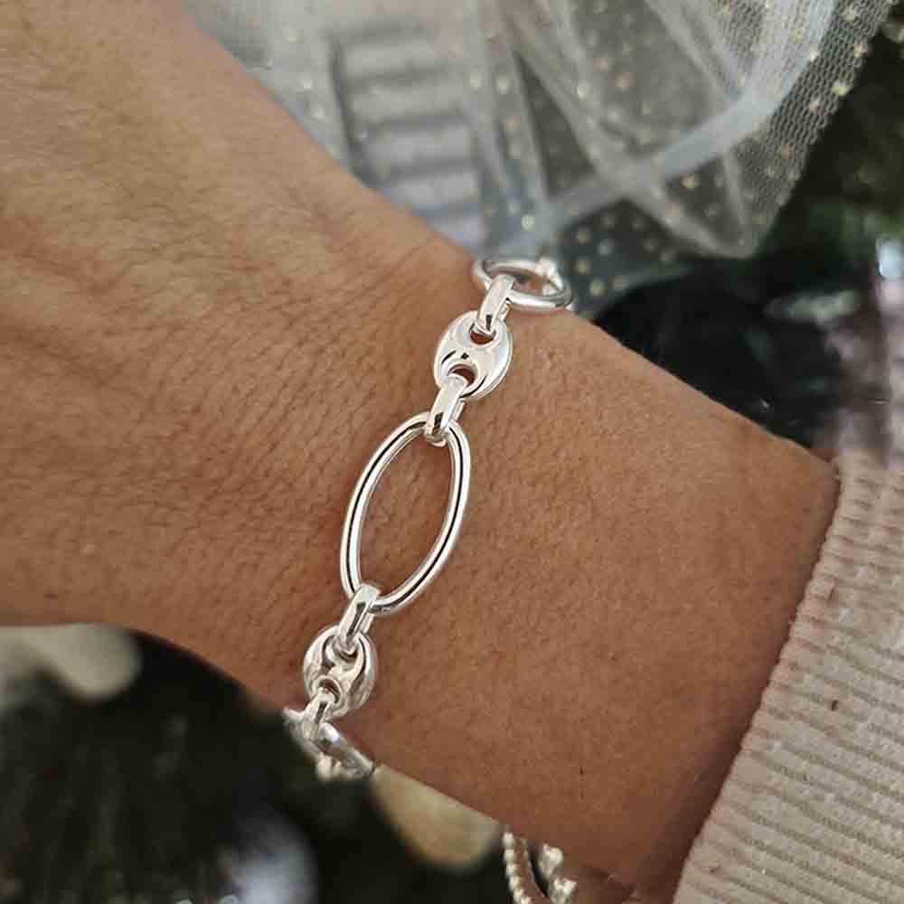 Elegante Pulsera Grano de café con eslabones, elaborada en Italia con acabados de alta calidad. Su medida de 19.5 cm de largo y 1 cm de ancho ofrece un ajuste cómodo y equilibrado. Ideal para realzar cualquier look con un toque clásico y sofisticado.