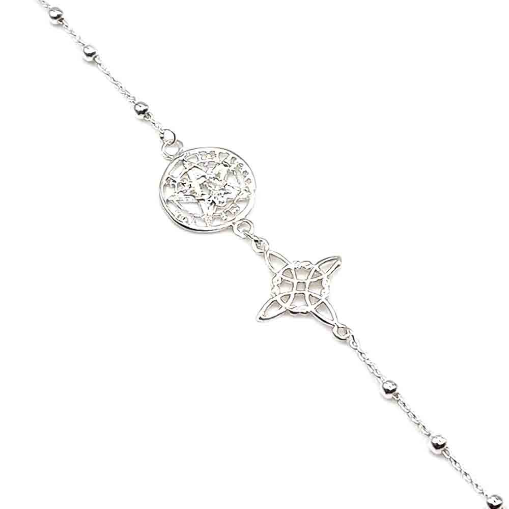 Pulsera Guardiana Protectora Doble Protección elaborada en plata, con delicada cadena adornada con bolitas de 2 mm que aportan un estilo elegante y sutil. Incorpora los símbolos del nudo de bruja y el tetragramatón, reconocidos por su significado de protección energética y espiritual. Su largo ajustable de 17 + 3 cm permite un ajuste cómodo, siendo una pieza ideal para llevar protección y estilo en el día a día.